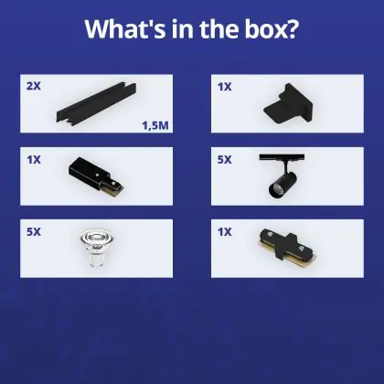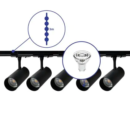 Complete Set 1-Fase Rail 3 Meter Zwart | incl. 5x Spot + GU10 2700K 3W Dimbaar + Eindkap, Voedingsconnector en I-Verbindingsstuk