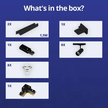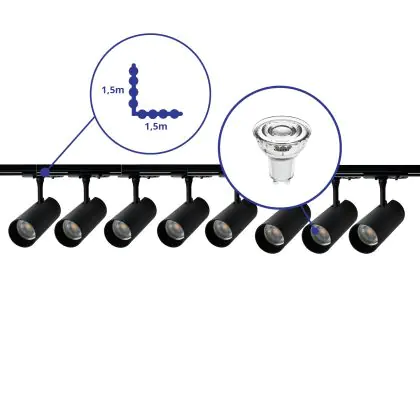 Complete Set 1-Fase Rail L 1,5 x 1,5 Meter Zwart | incl. 8x Spot + GU10 2700K 3W Dimbaar + Eindkap, Voedingsconnector en L -Verbindingsstuk